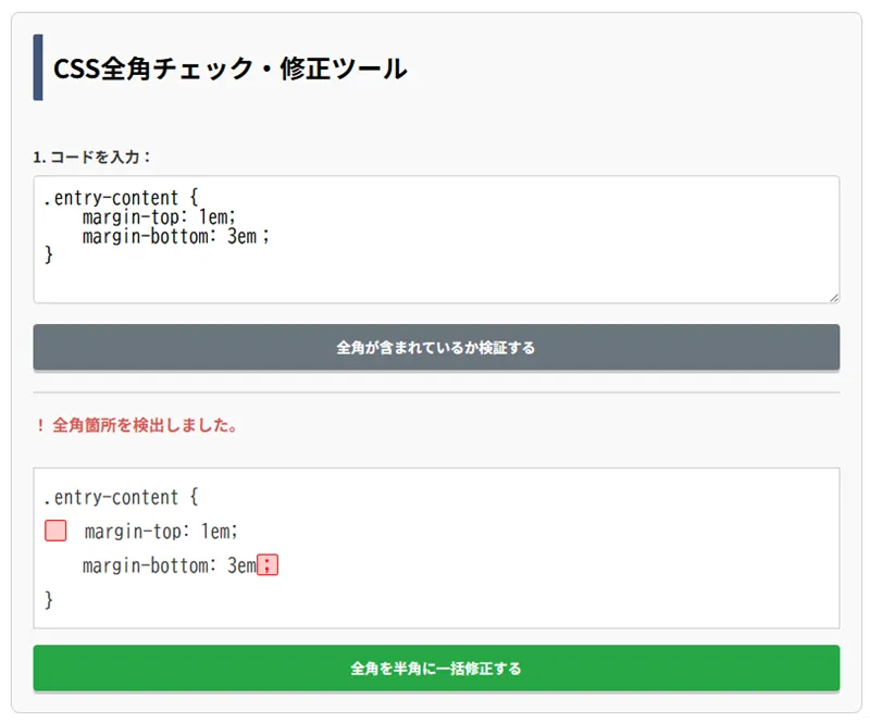 CSSを追加した際にデザインが反映しないなどの、パッと見では分からない場合にこのツールを使って全角が紛れていないか確認しましょう。