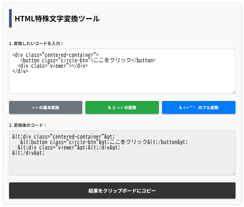 記事の中でコードを見せる際にHTMLが実行されてしまう環境の場合は、HTML特殊文字変換ツールが役立ちます。